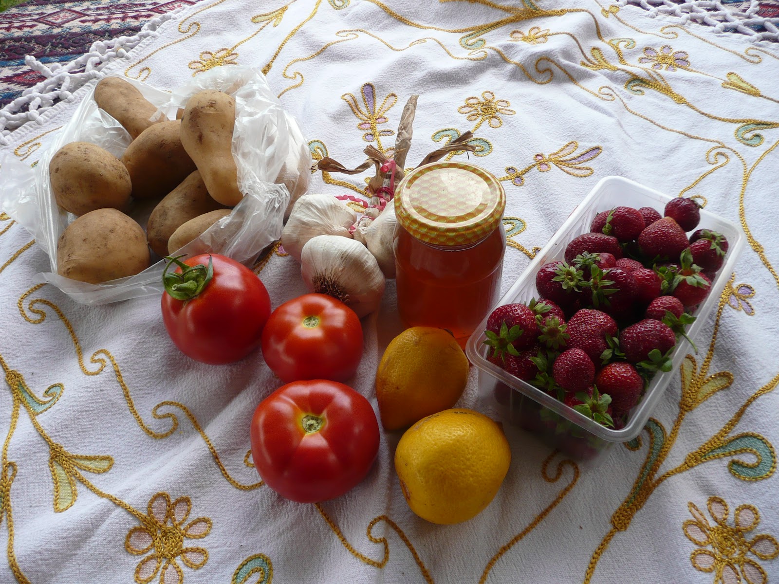 We headed off to the local Wednesday fruit and veg market where the farmers wives come to sell their produce. We have returned with a punnet of strawberries, honey, potatoes (Datca potatoes are the best we have ever tasted), garlic, lemons and tomatoes. Following the success of my tomato plants, I shall try growing the garlic. Friends have told me I just have to shove a few cloves in the earth, so we'll see.
